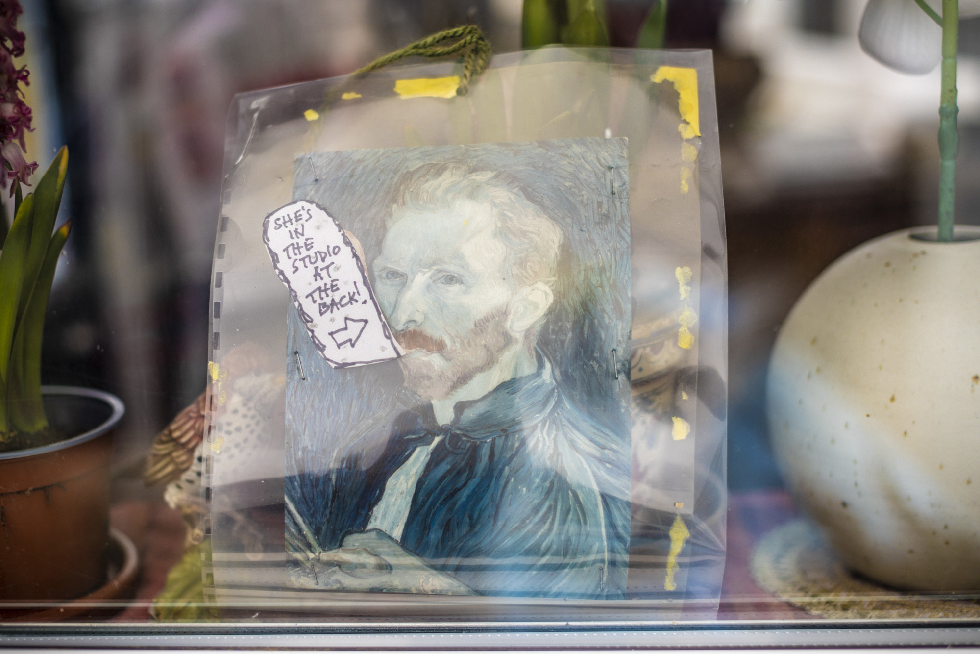 She greeted us with a wave from the studio at the end of her garden. A giant broken pencil, a find picked up in a street in Elephant and Castle, swings over the entrance – “I work under the sign of the broken pencil” Pamela quips as she ushers us in.