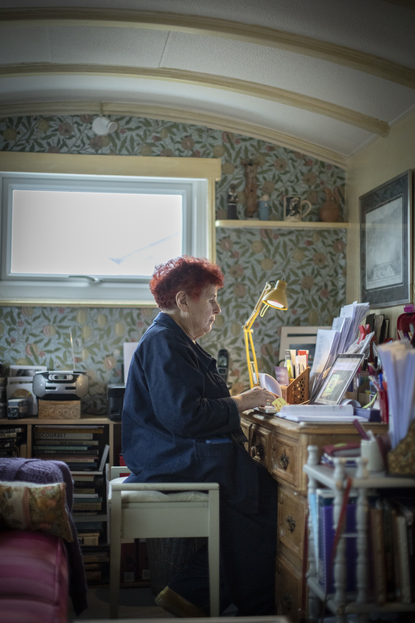 The sound of the sea crashing on the pebbles a few yards away recedes as we enter the warm, cocooning, colourful embrace of her studio.
