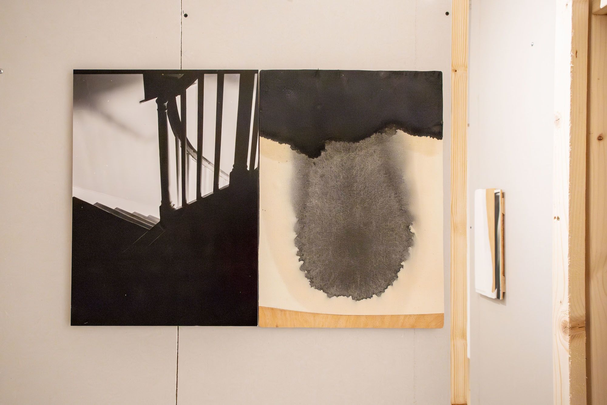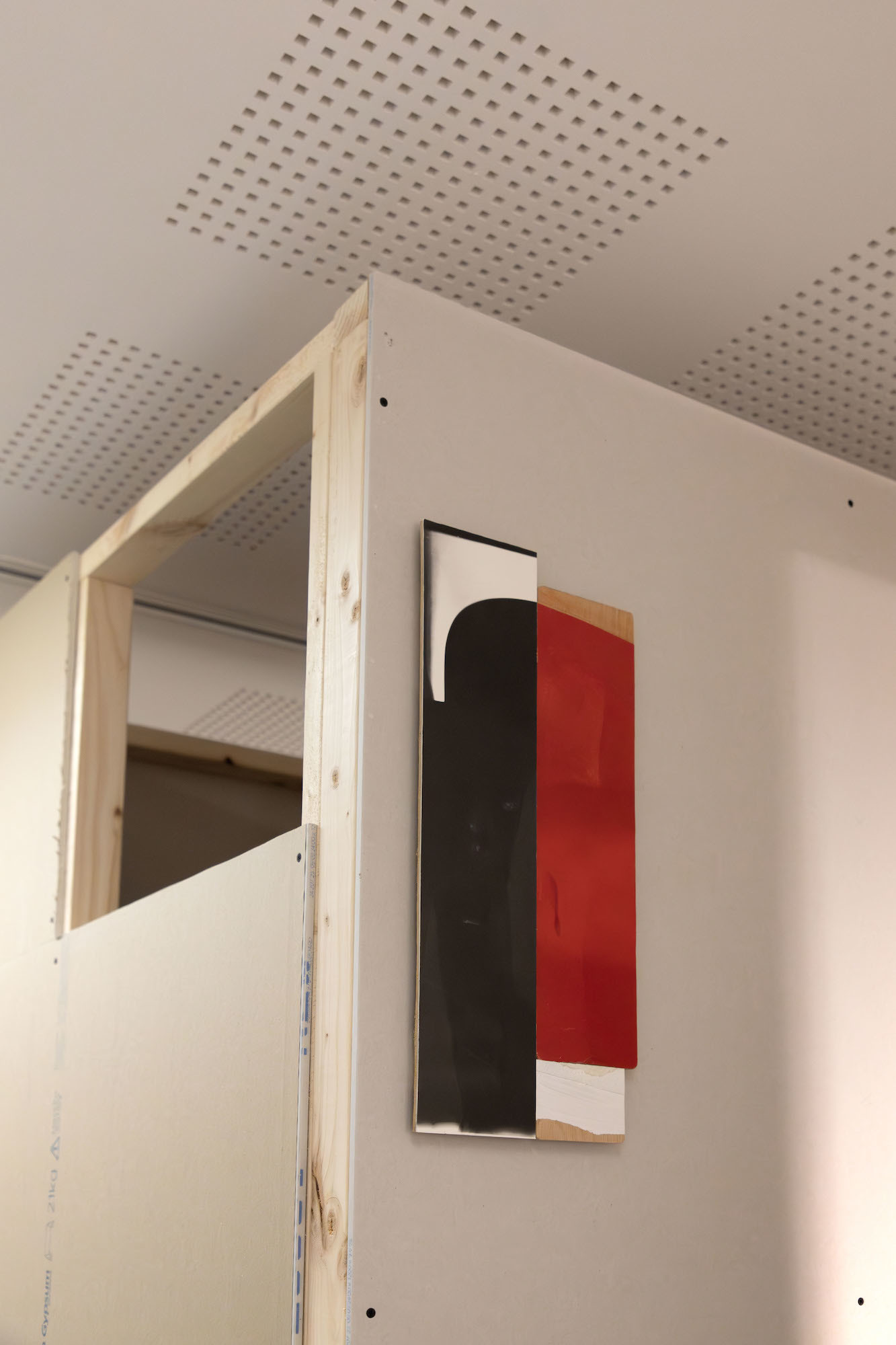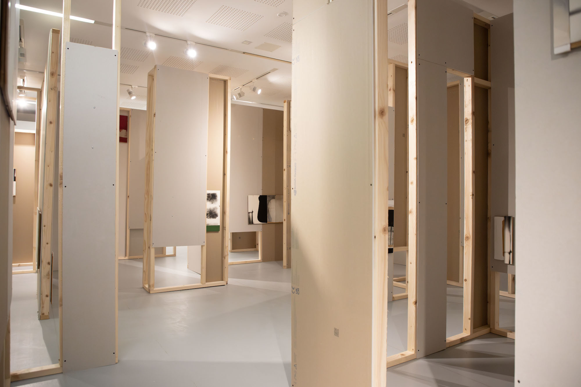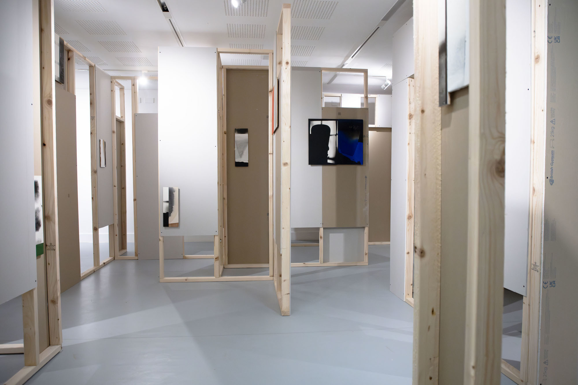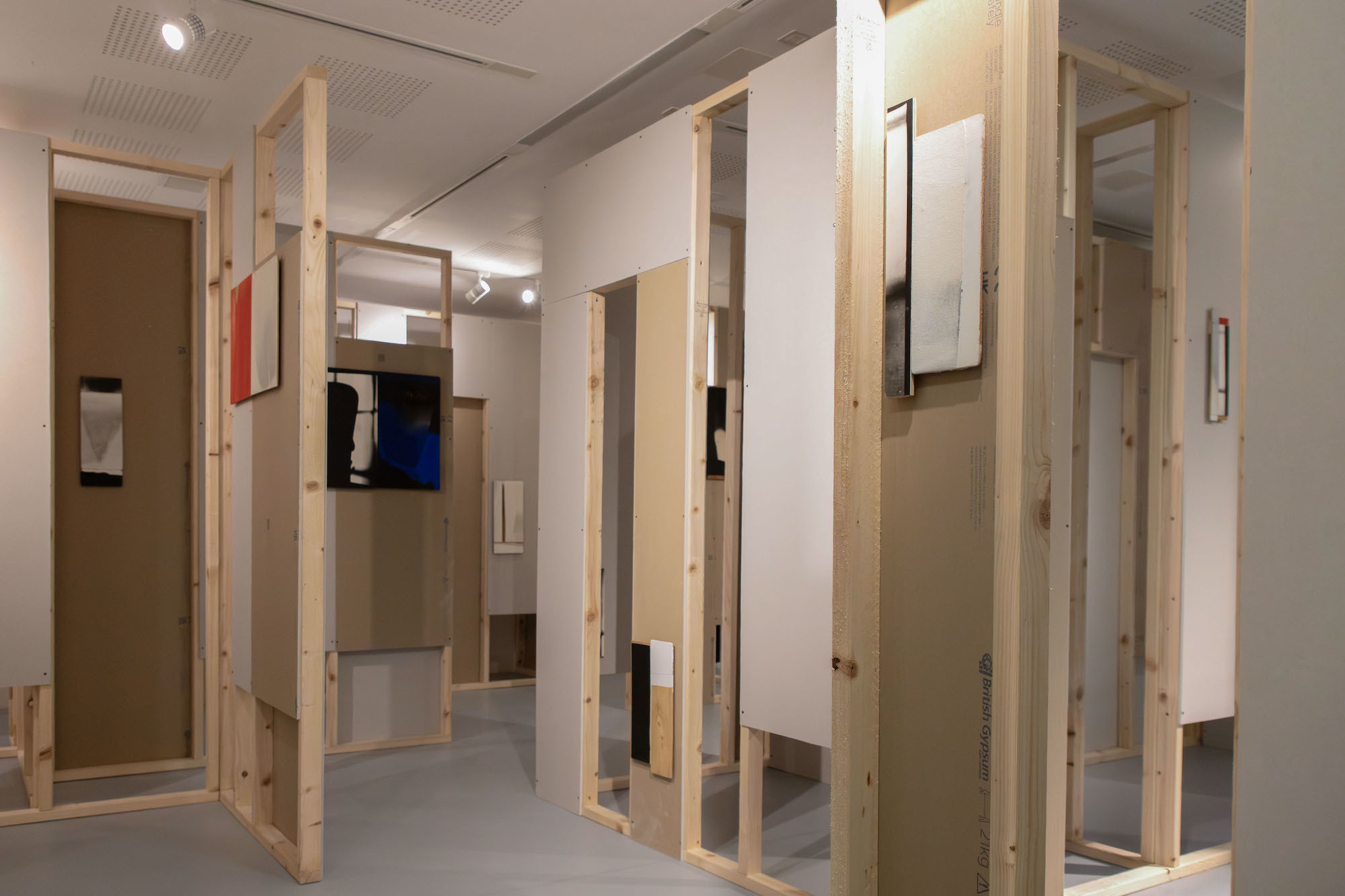 McKeever’s site-specific installation, originally shown at Matt’s Gallery, London in 2017, is presented in a newly envisaged installation specifically made for the Upper Gallery at AUB. Using standard building materials, 3 x 2 stud walling timbers and sheets of plasterboard, often with the manufacturers’ markings left exposed, the artist creates what might loosely be called a labyrinth through the gallery. Making the space a provisional structure of passageways, cul-de-sacs and multiple viewing points.