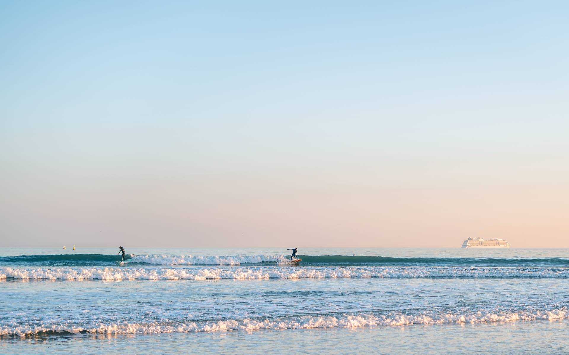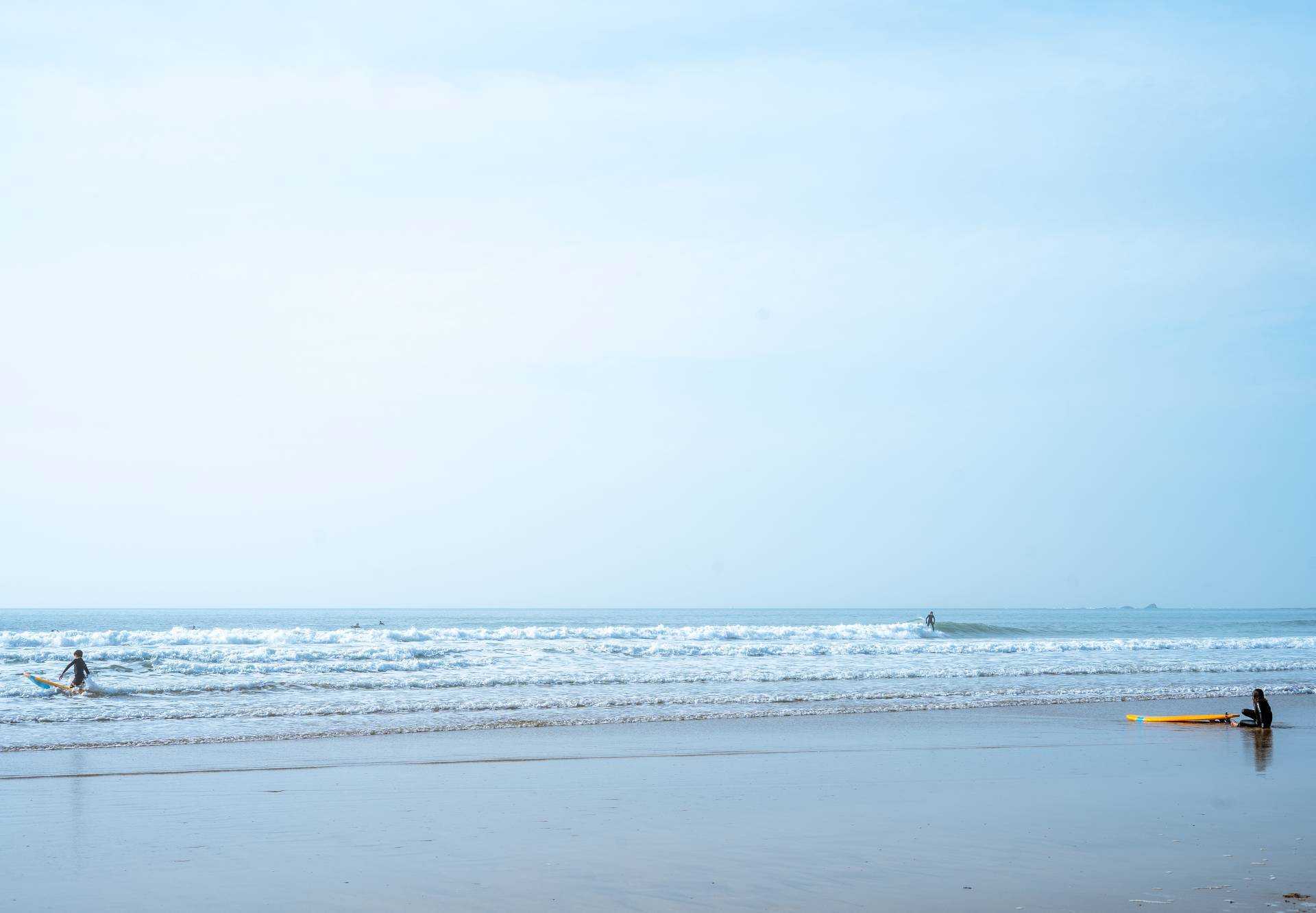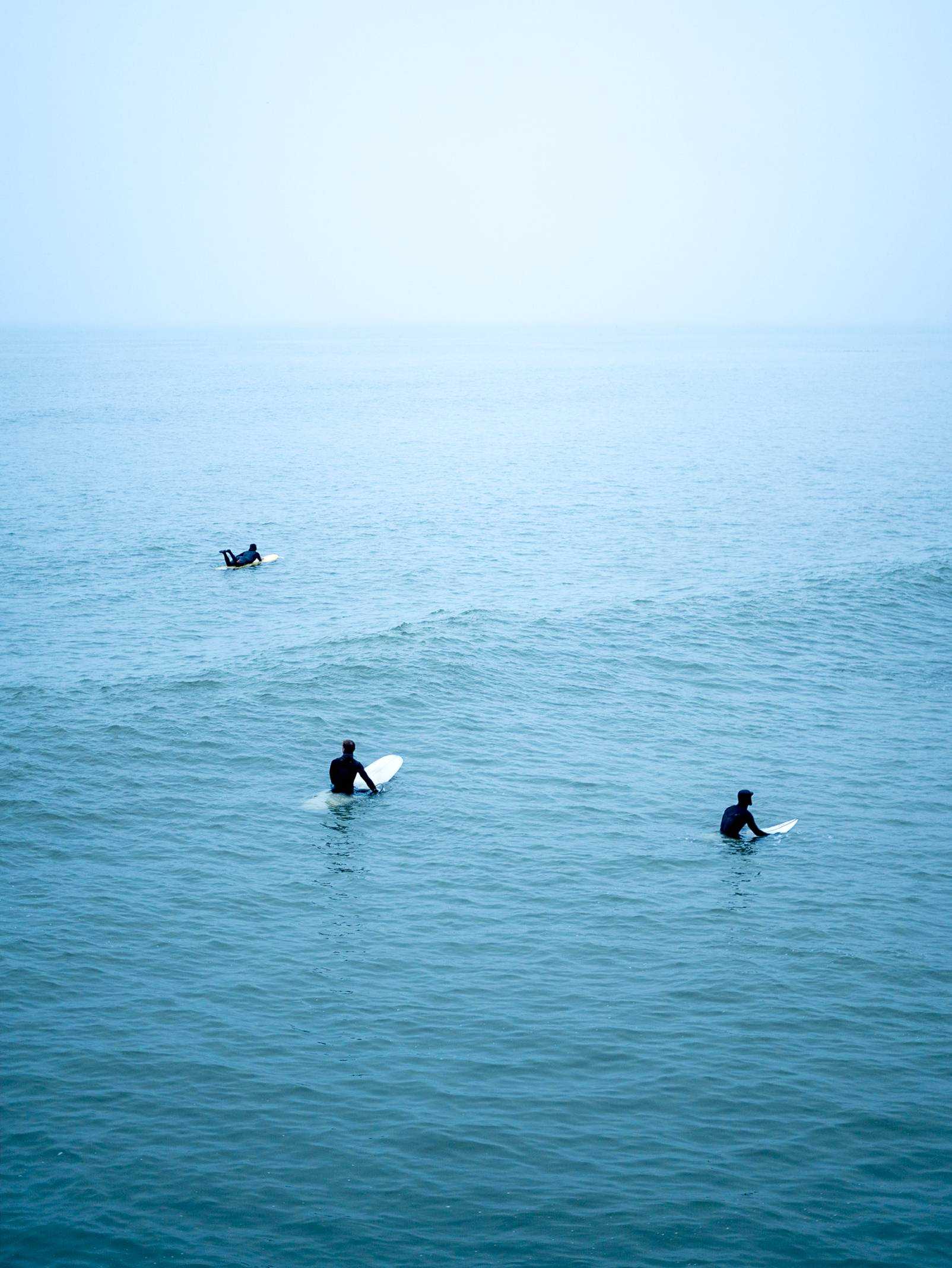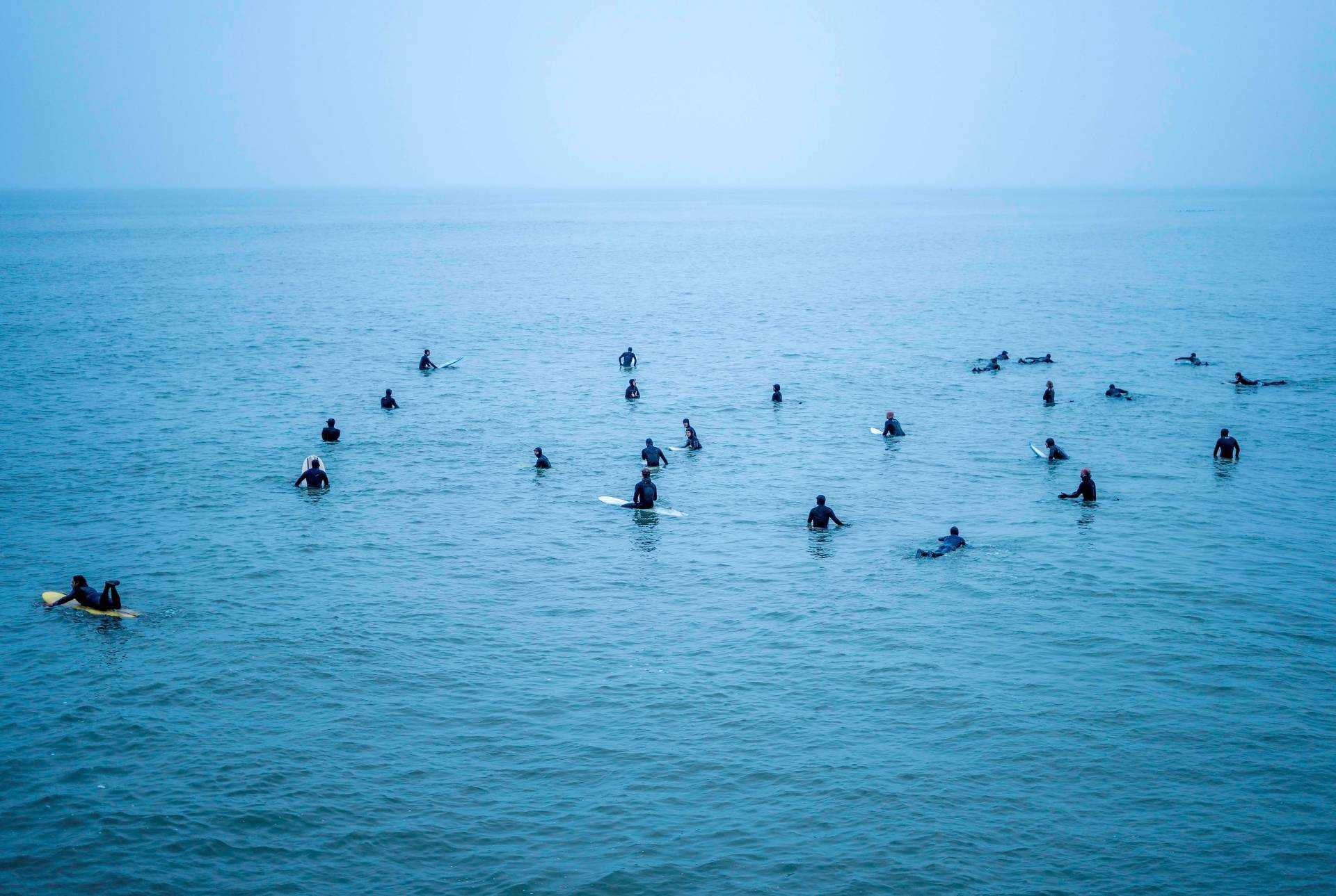 The piece portrays the stillness of the surfers, just waiting. Floating peacefully in the sea, waiting patiently for the next swell of waves. It promotes calming qualities onto the viewer. The cool blue colour tones dominating the image, alongside this peaceful human interaction promotes these calming effects of the waiting of the waves.