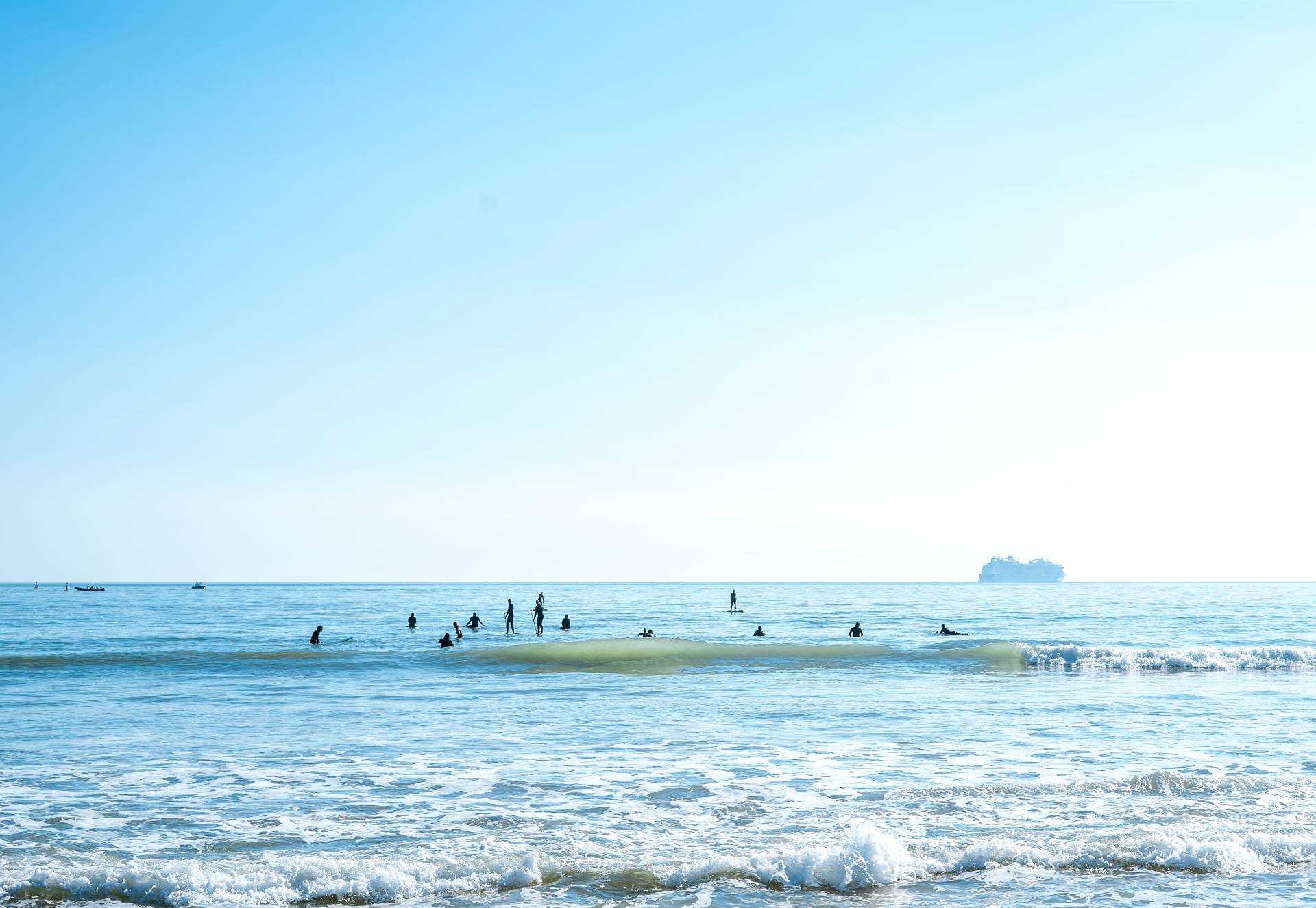 The photograph 'Whilst We Wait' was taken from the vantage point off the pier at Bournemouth beach, during the month of February 2021. The piece captures the calmness of both the seascape environment and the scattered human forms peacefully waiting for their next swell. The image brings our attention to the relationship that humans have with our natural surroundings, specifically the ways in which we interact within the natural landscape through activities of recreation and leisure.