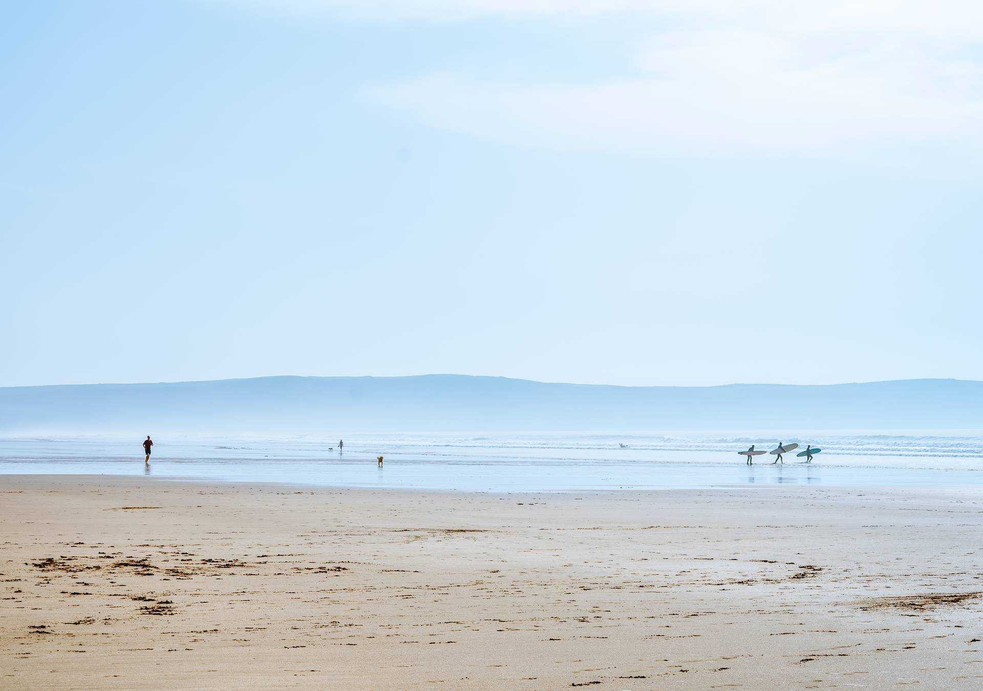 The piece 'Whilst We Wait', perfectly captures this. The interaction between man and the landscape is represented through the activity of surfing. The scattered surfers appear like tiny ant forms against the blue seascape canvas, bringing our attention to insignificance of man when surrounded by such a vast landscape.
