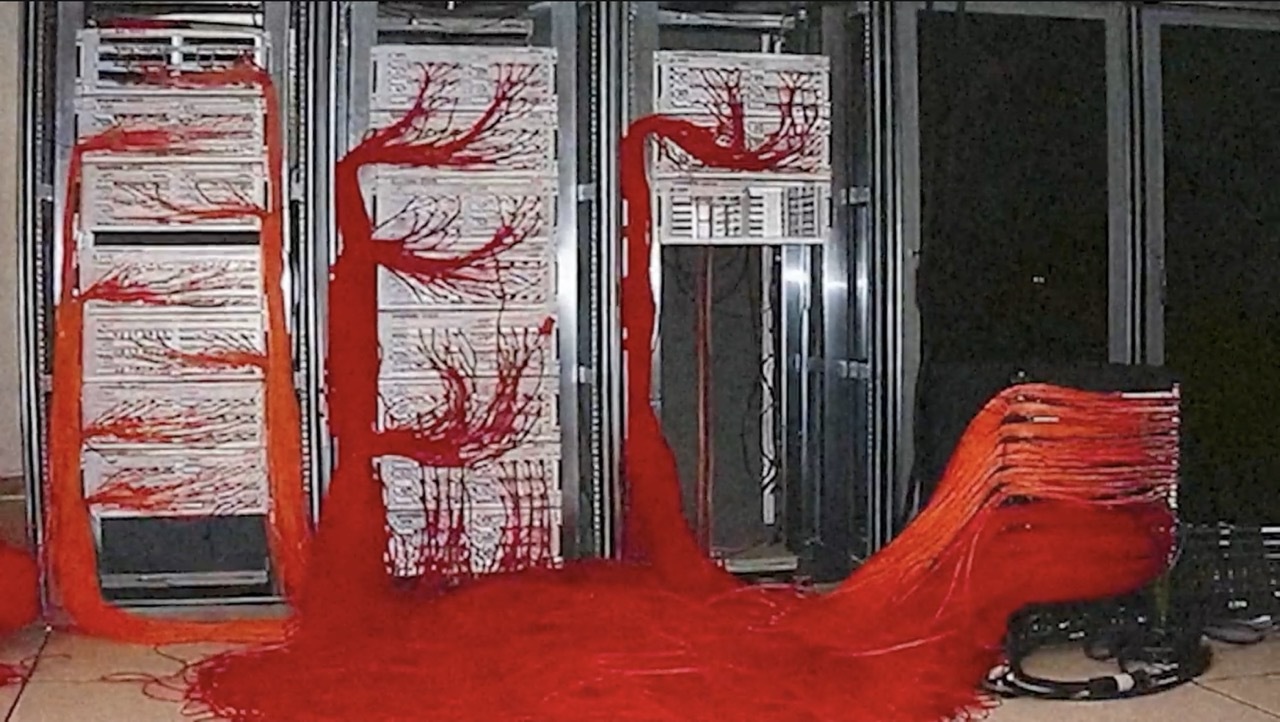 My research began with one video: a deer that had broken into a video game server room. Reposted until it had lost context, the deer seemed more symbolic than literal. The work appropriates footage from video games, digital simulations of mycelium growth, and photos of poorly organised cables from the subreddit r/CableGore.