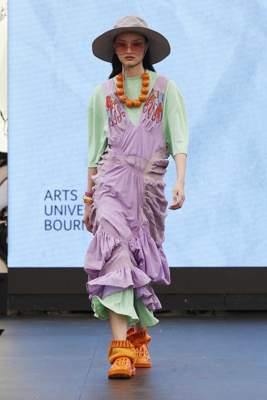 The aspiring designer, who graduated from AUB this month, developed new and innovative approaches to smocking, digital and screen print and painstakingly hand-sewed knitwear creating a visual and textural feast. Russia’s work was shortlisted for the GFW Fashion Concept Award 2022 and has also won the Director of Schools Endowment Prize at AUB Graduation 2022.