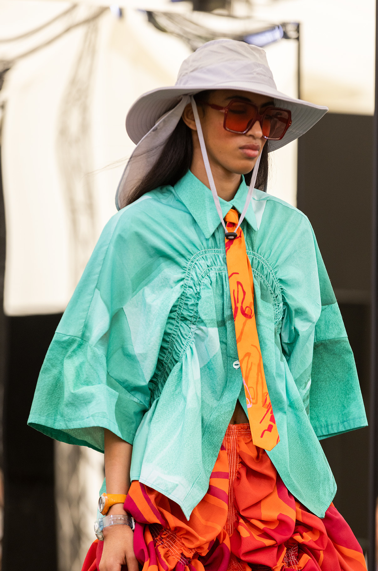 Russia said: “STOP & STARE is a womenswear collection unbound by gender norms and unrestricted by time of day. The concept draws inspiration from my grandma whose style is curious and undefined. With her spirit as my muse, I integrate furniture designers and architects to inform silhouette and colour.