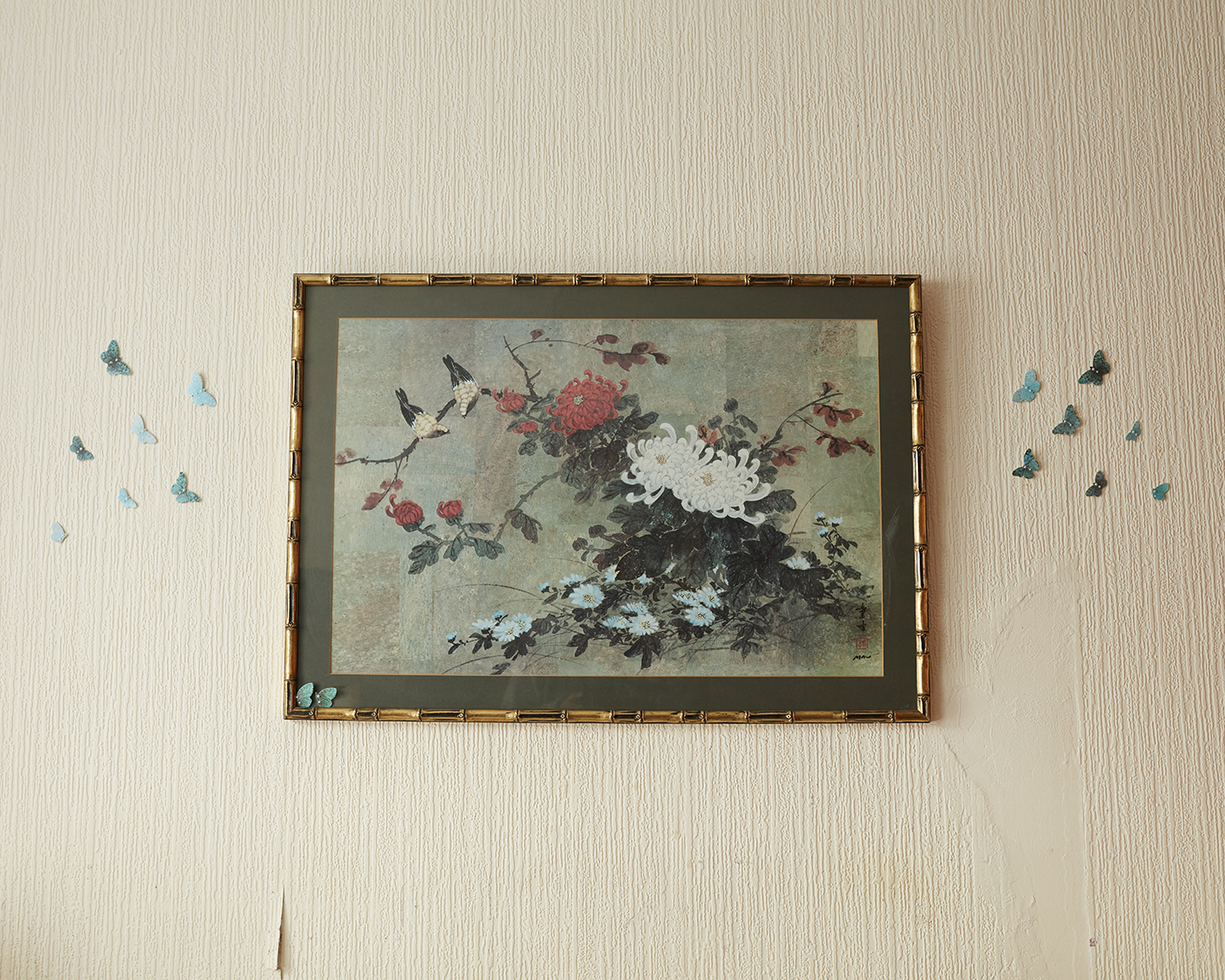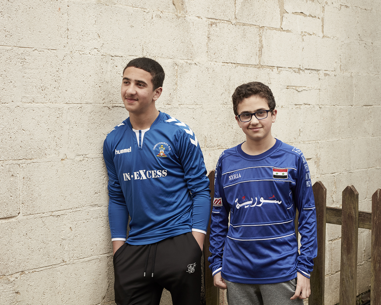 Anas, now 15, plays football for Christchurch. I ask if I can photograph the boys together outside, Anas wearing his Christchurch FC shirt. Amjad, now 13, disappears for a minute and then joins us in the garden wearing his Syria shirt. Back inside I notice there are lots of tiny butterflies decorating the walls of their home. Ahed tells me that back in Syria the walls of the school where she worked were riddled in bullet holes, and she used to decorate them with butterflies and flowers so that the children would feel happy when they arrived.